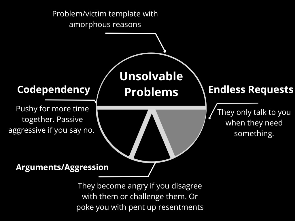 Passive-aggressively poke or target you with insults if you challenge the unsolvable problem too directly. Or if they’ve just built up resentment.